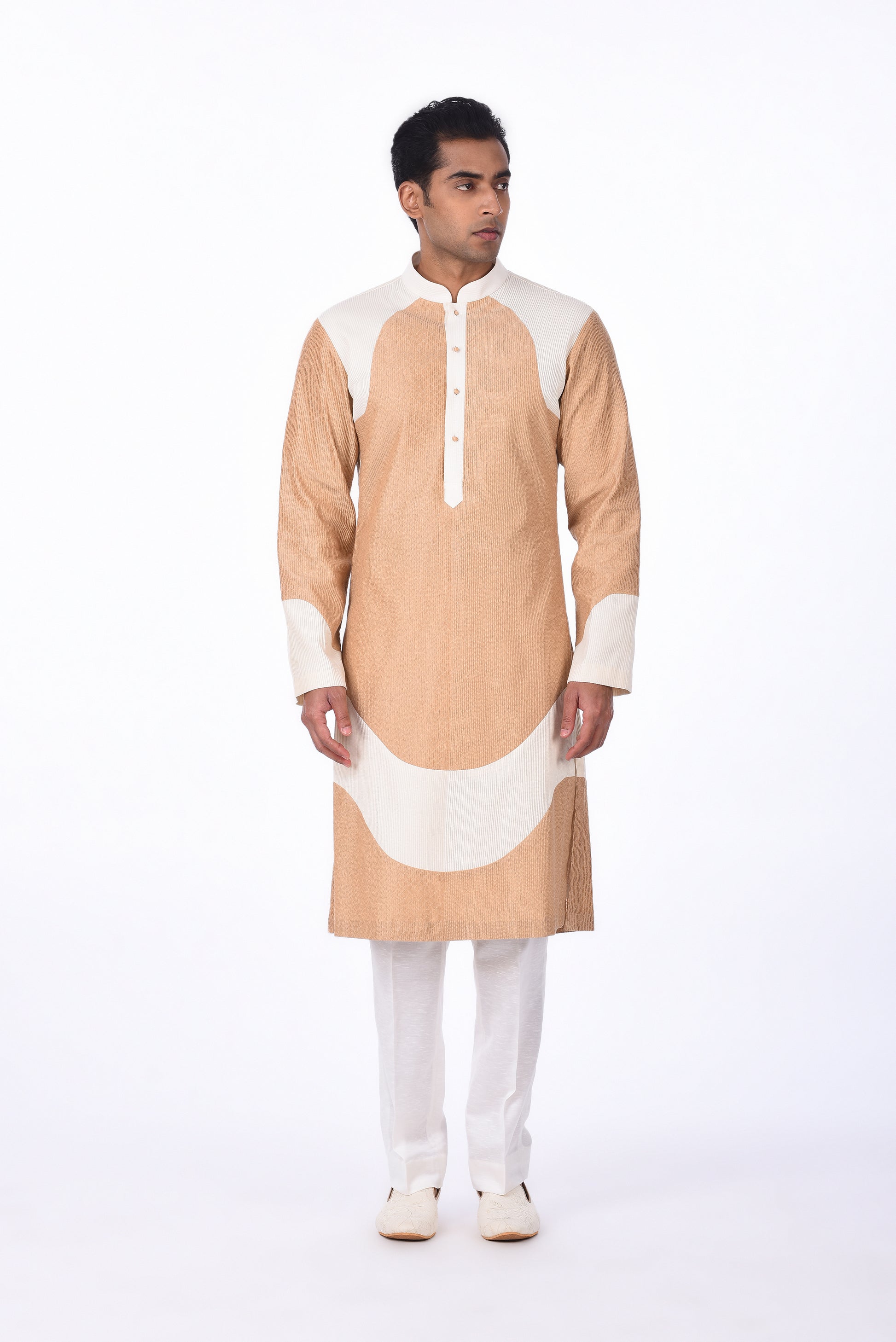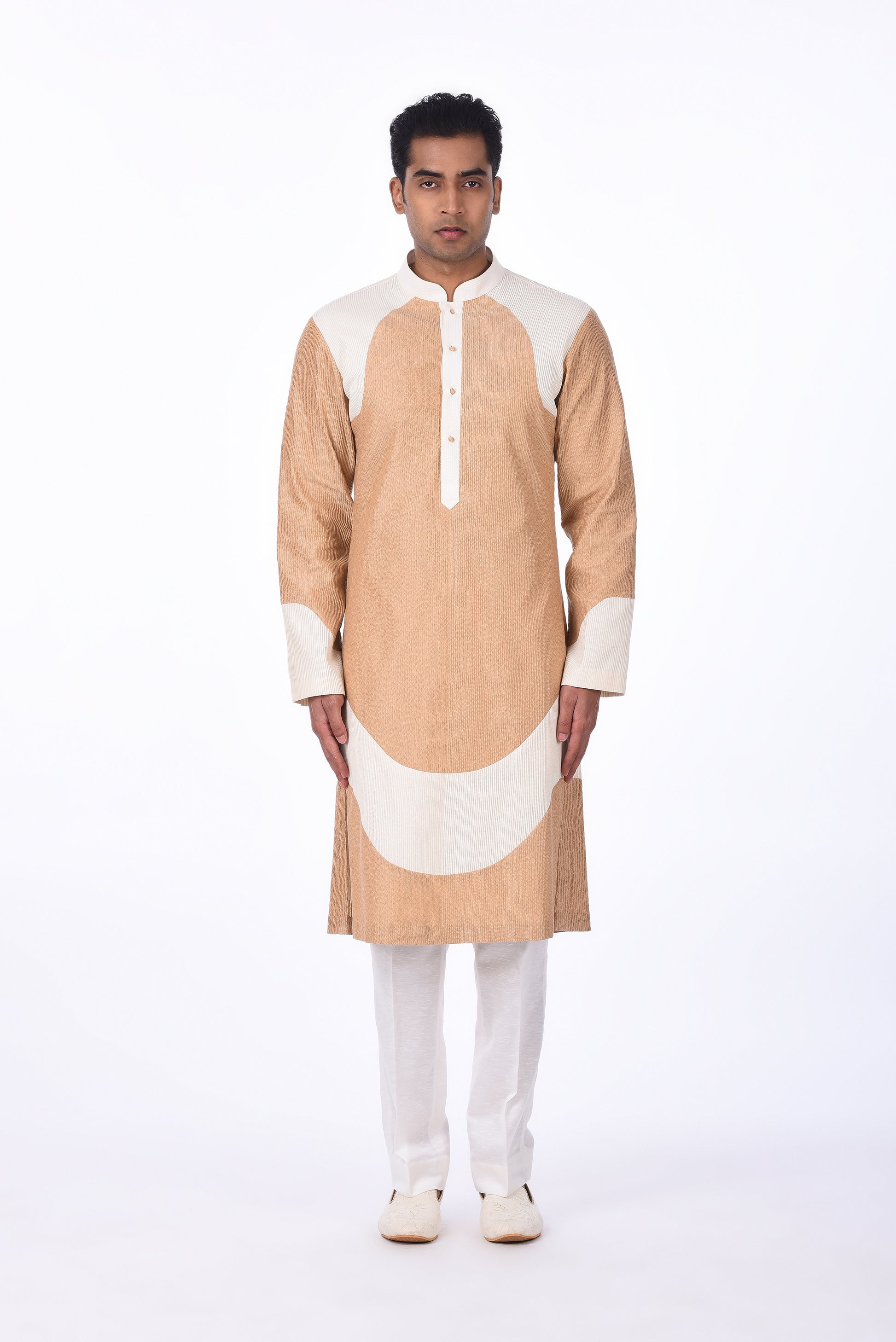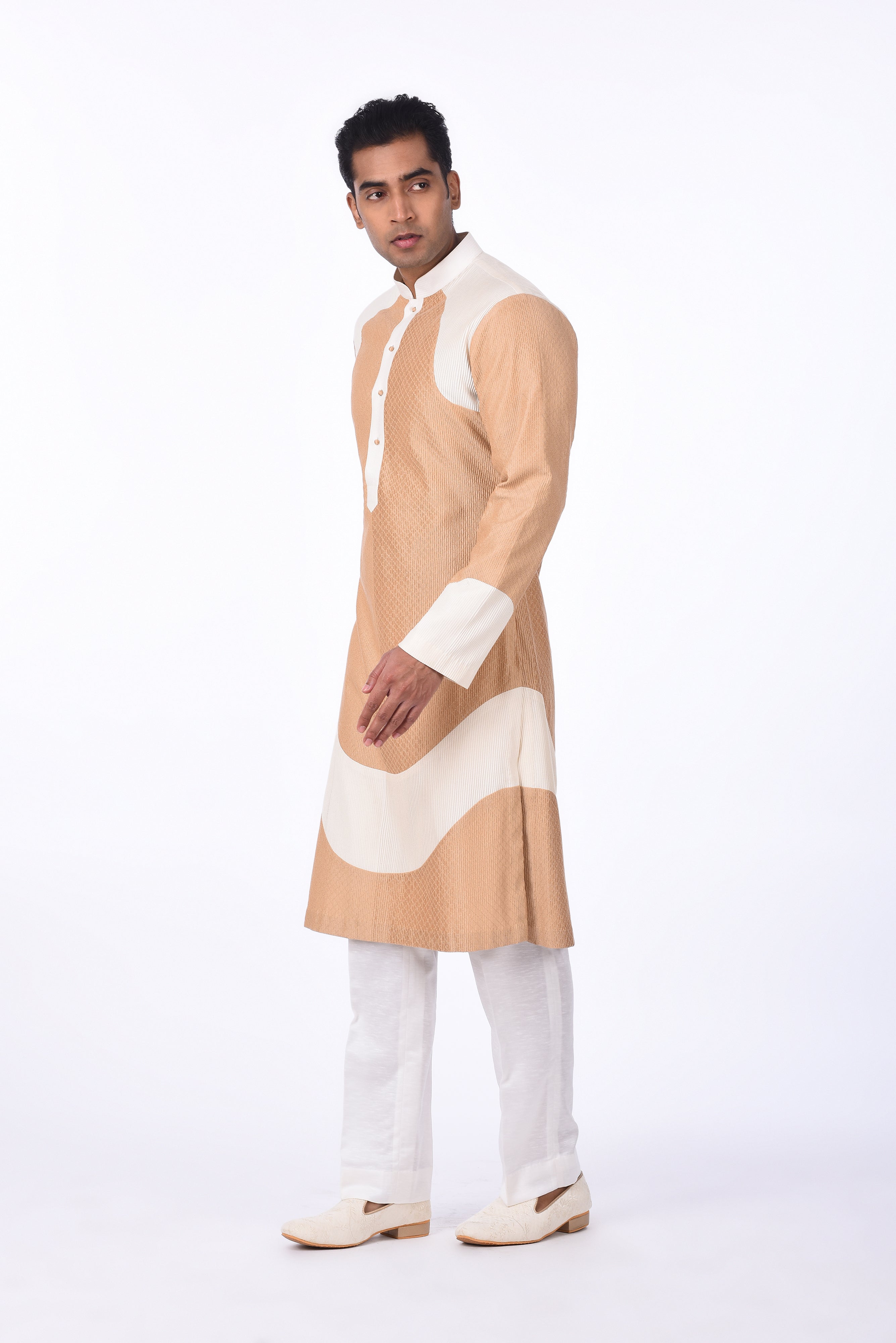 Textured Fabric: Both the tan and ivory sections appear to have a consistent vertical or ribbed texture.
