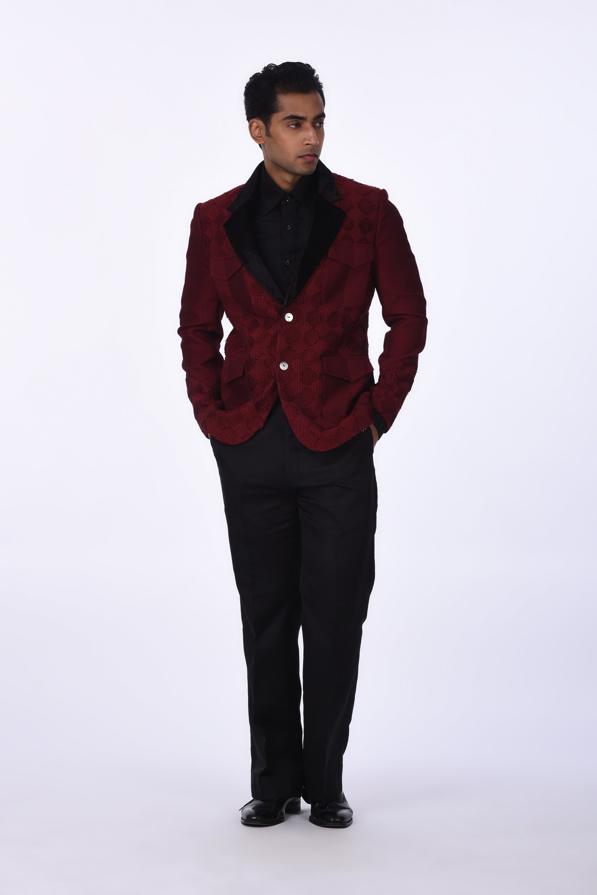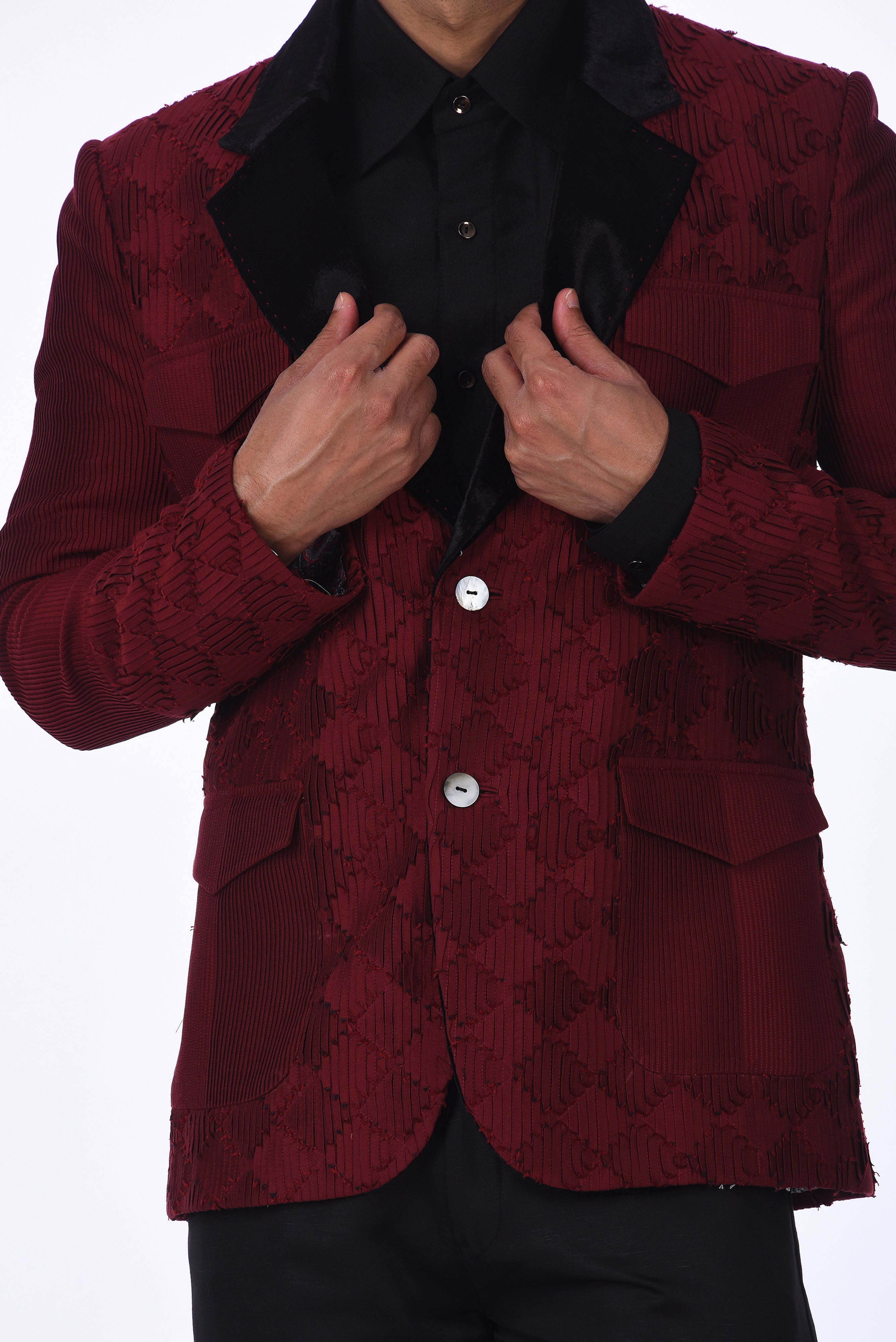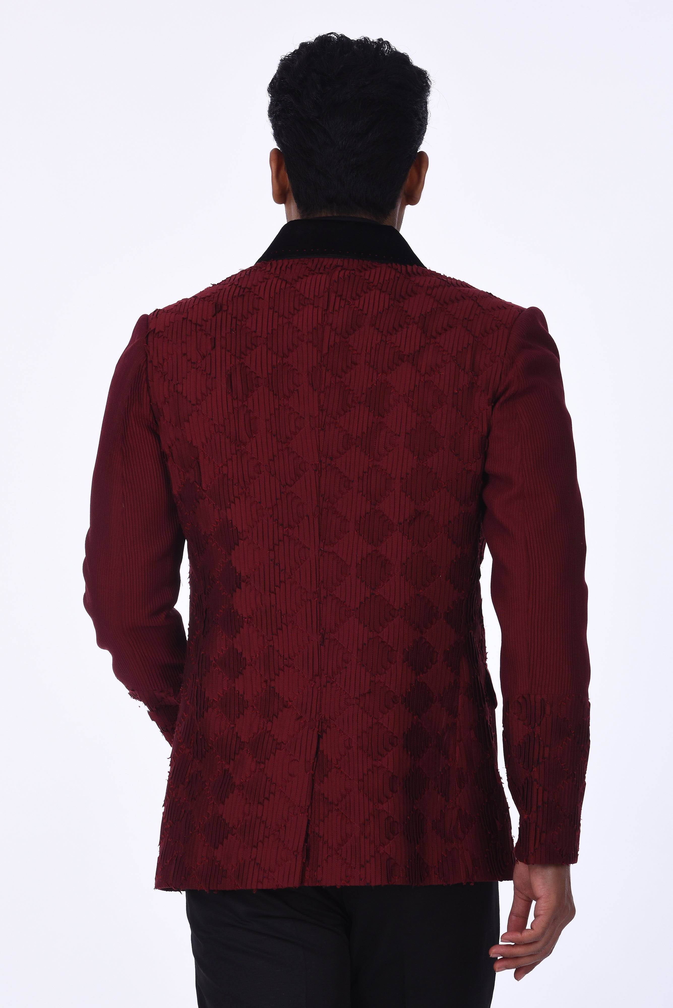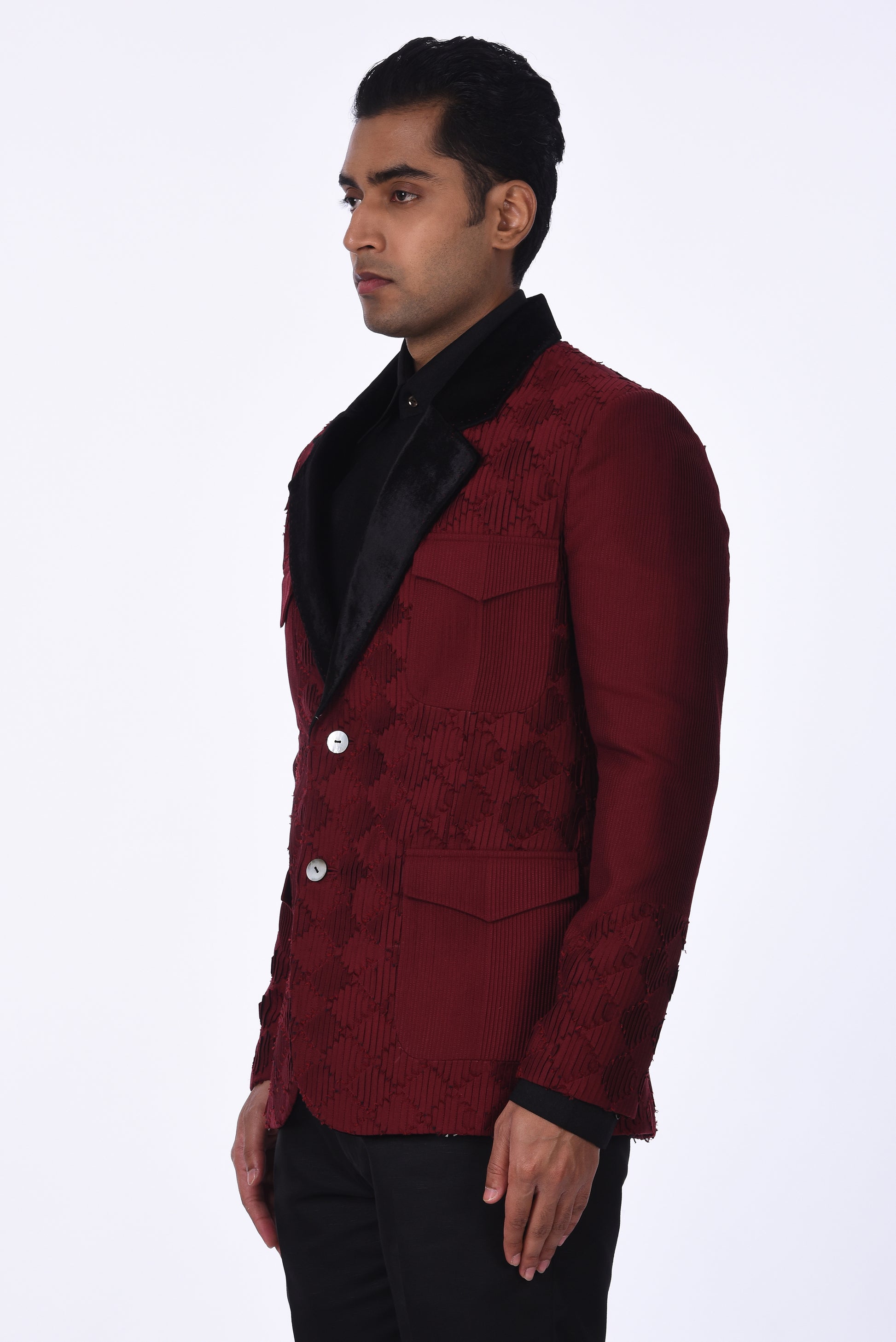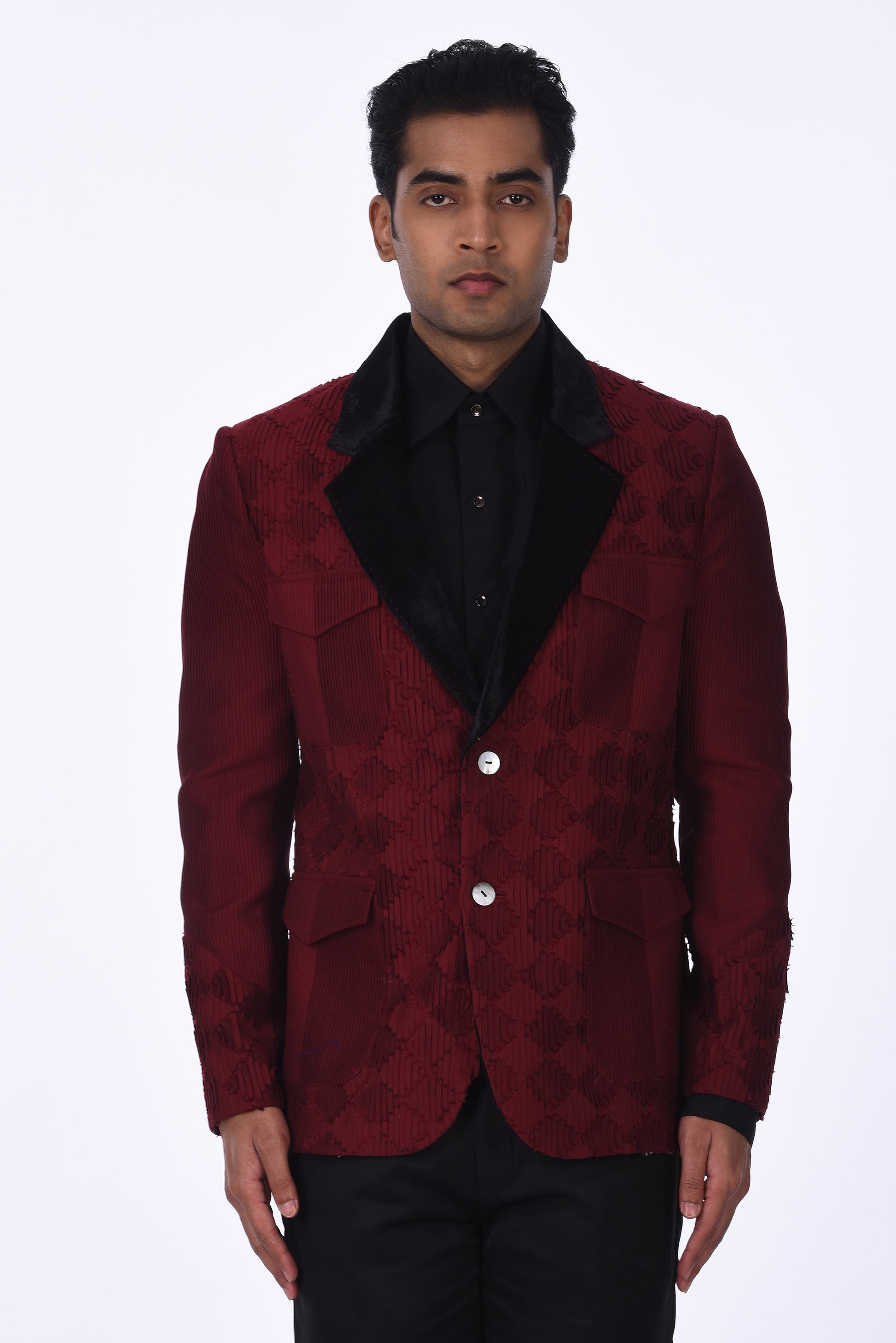 Color/Style: Rich maroon with a subtle, textured pattern and black velvet lapels.
