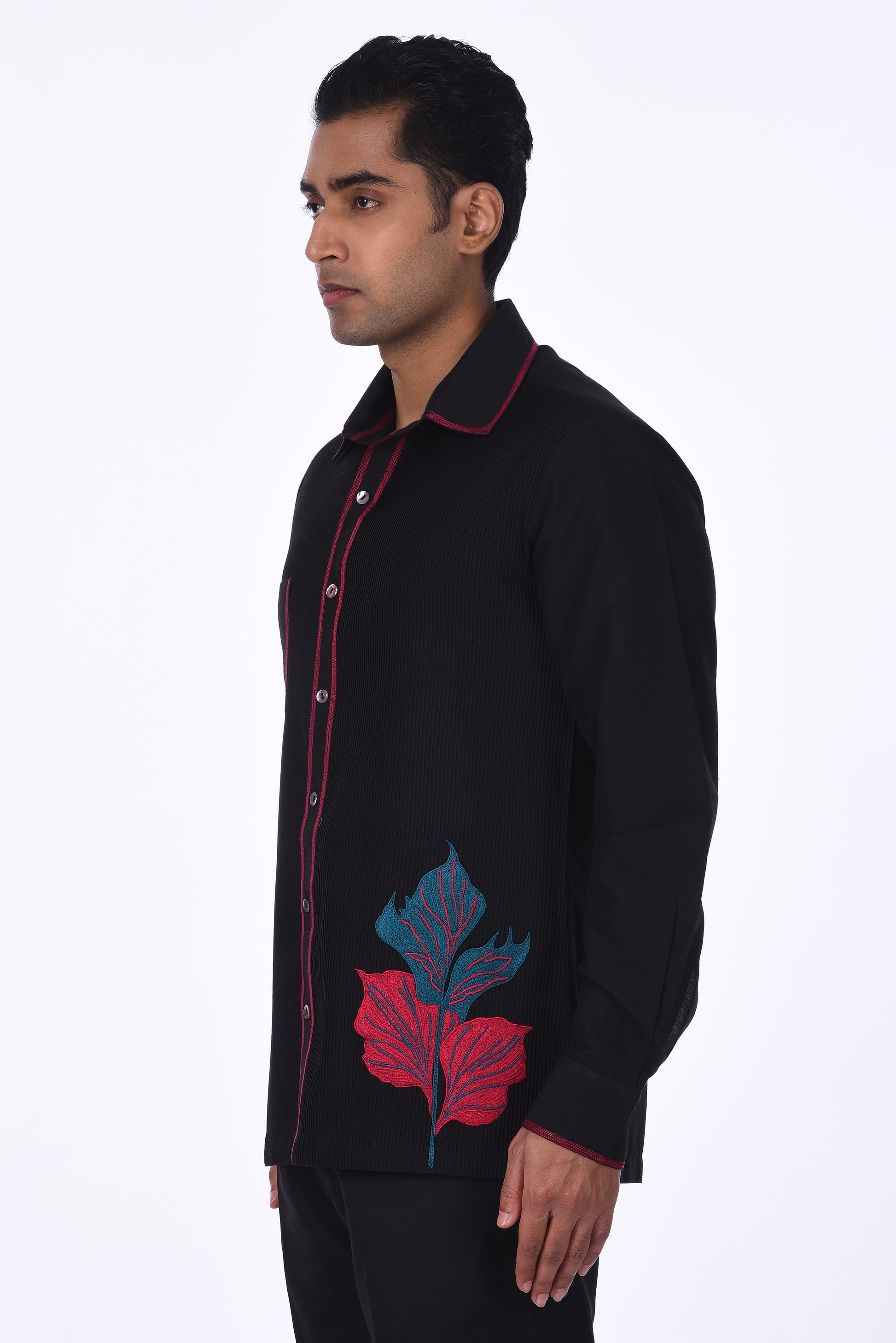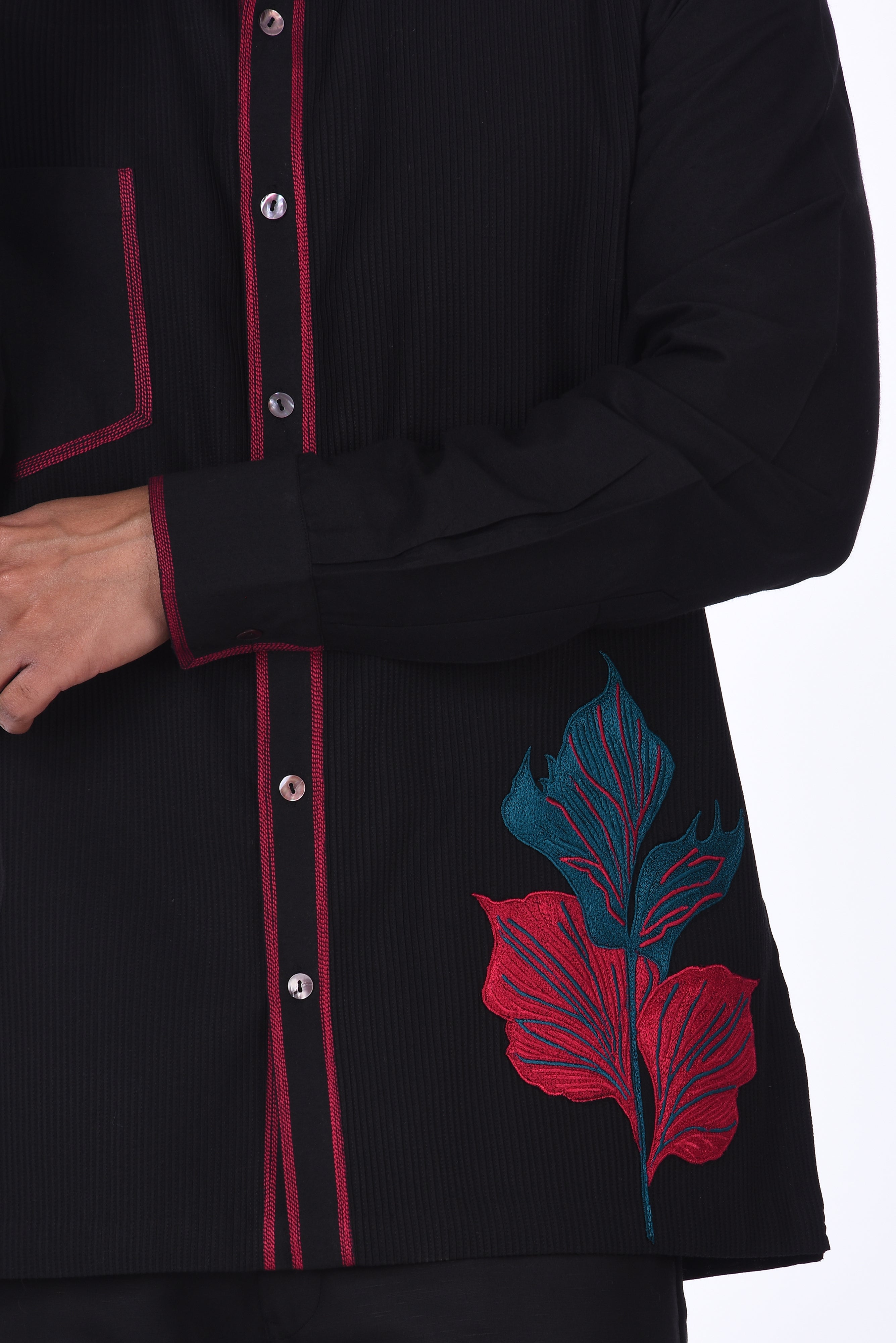 Color Style: Black with a fine vertical texture, accented with vibrant red piping and a colorful embroidery design in shades of red, maroon, and teal.