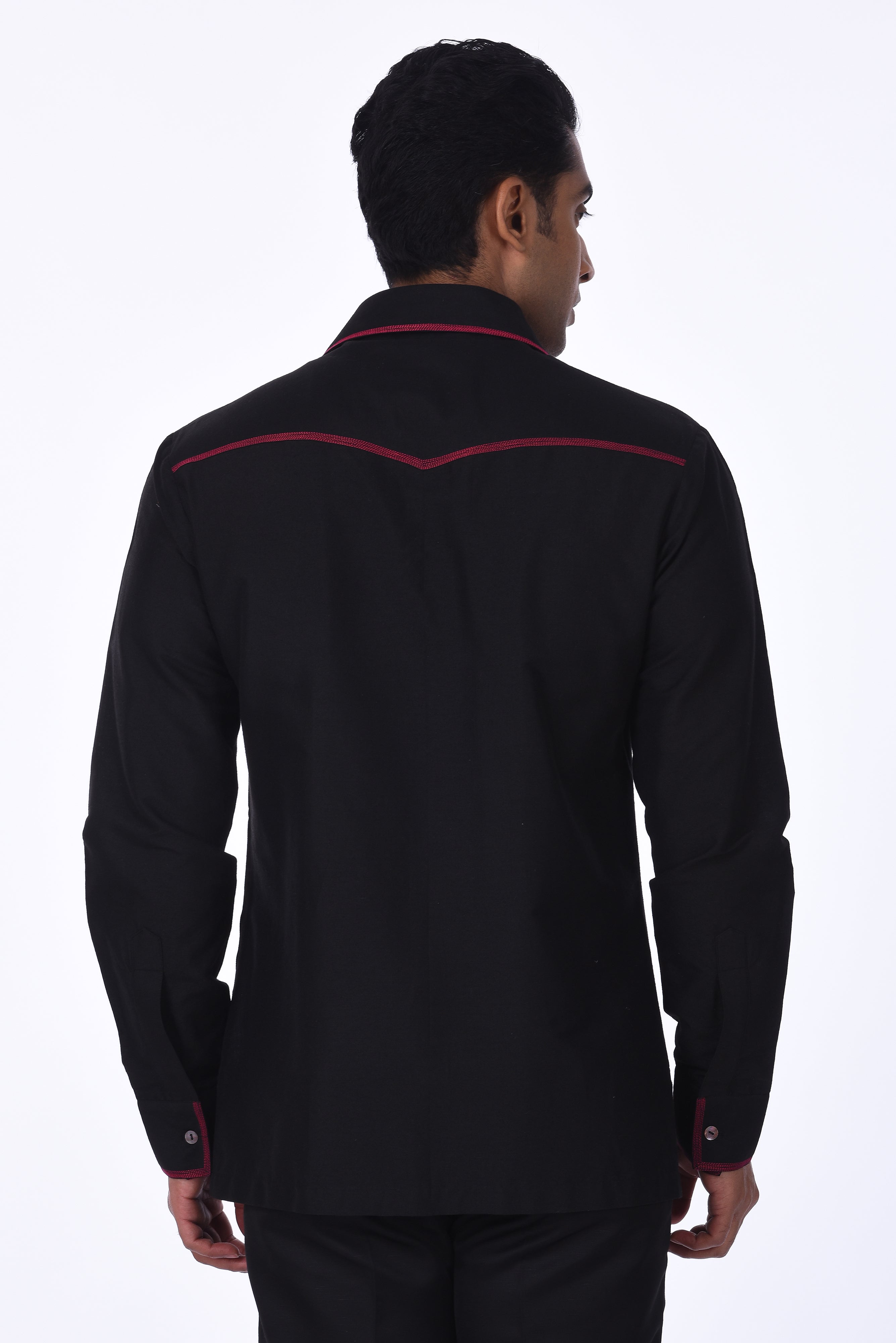Contrast Piping: Bold red piping along the placket, collar, and pocket edge for a sharp, defined outline.