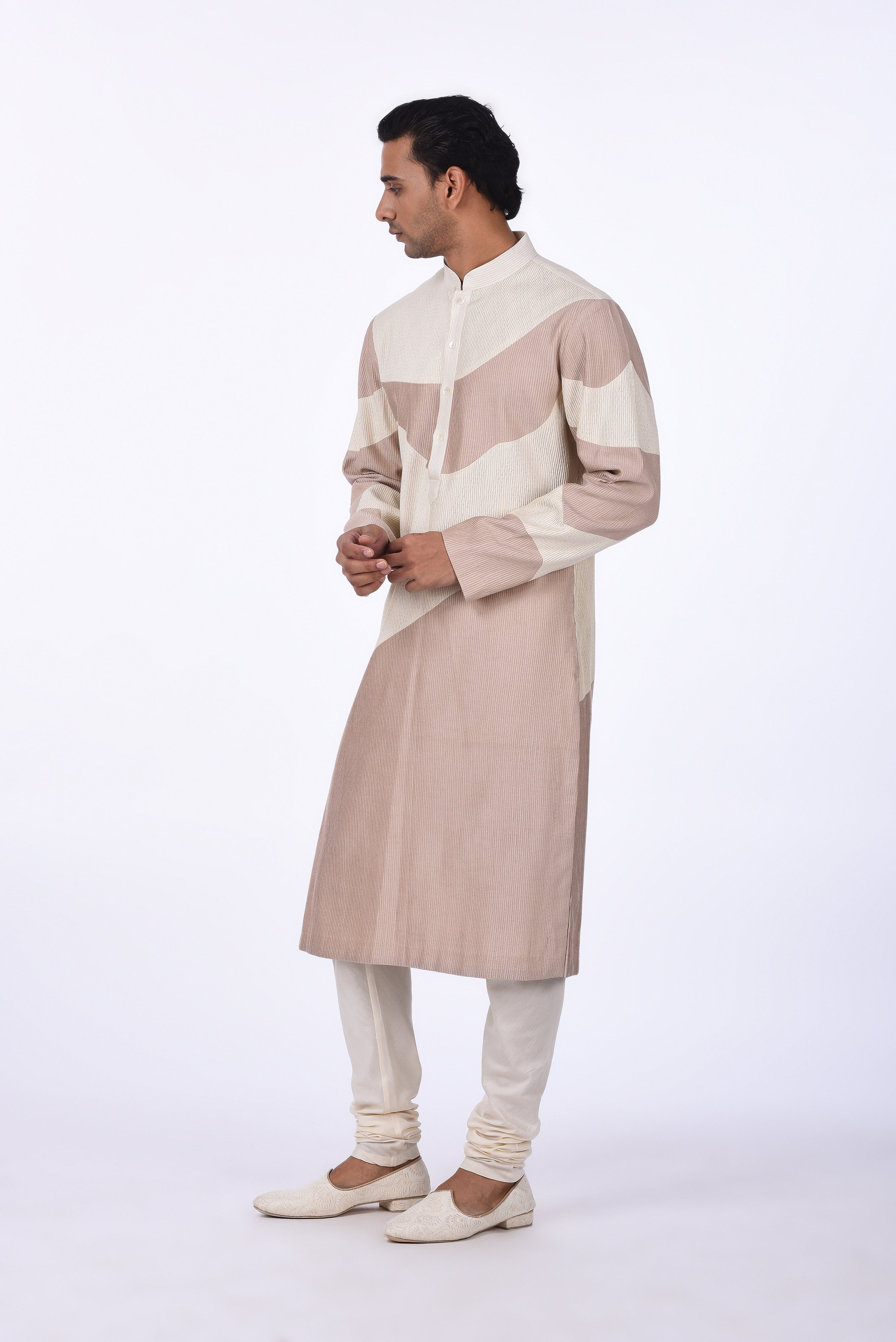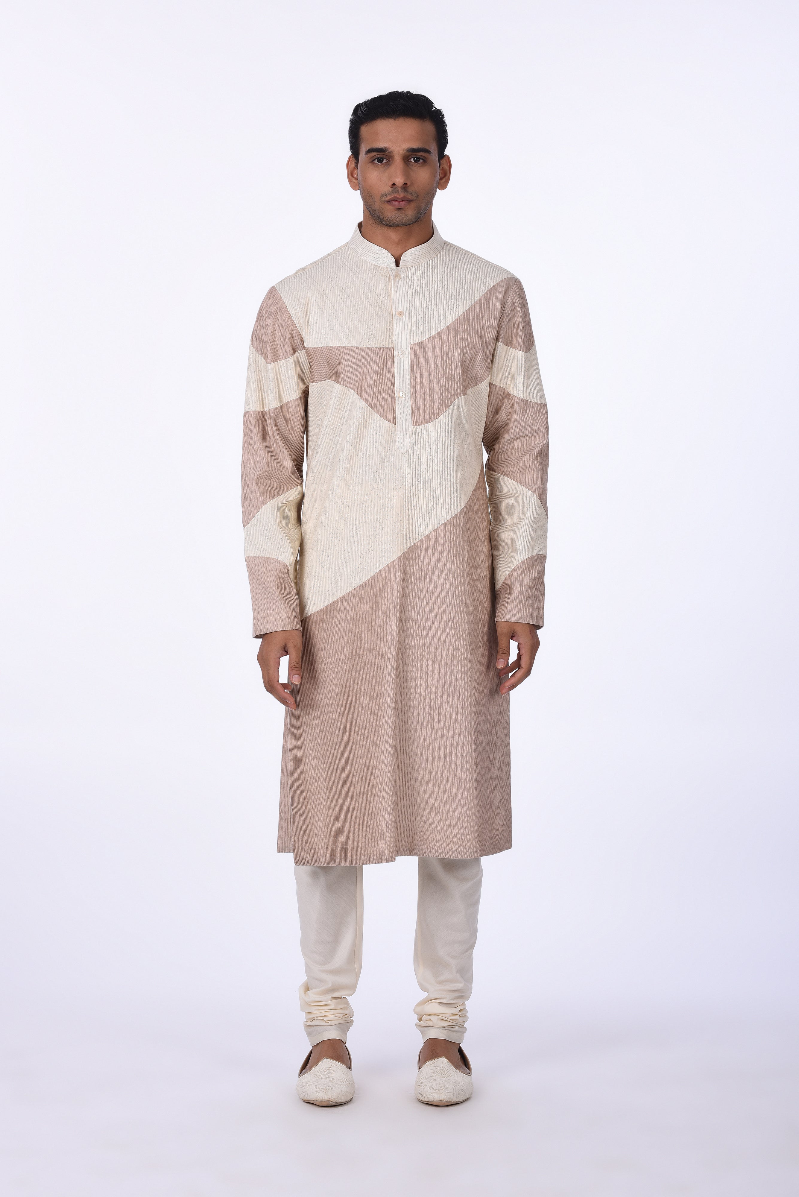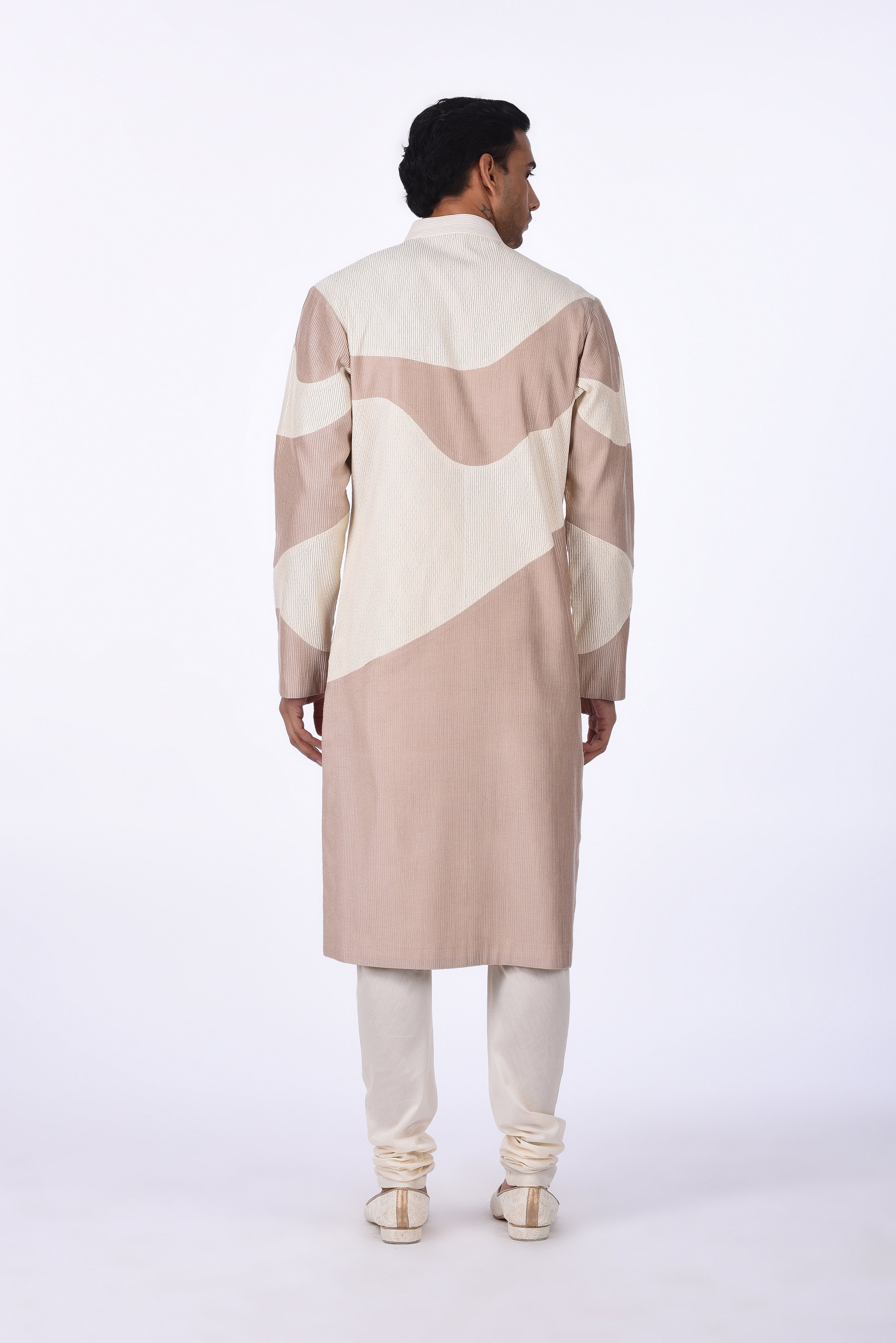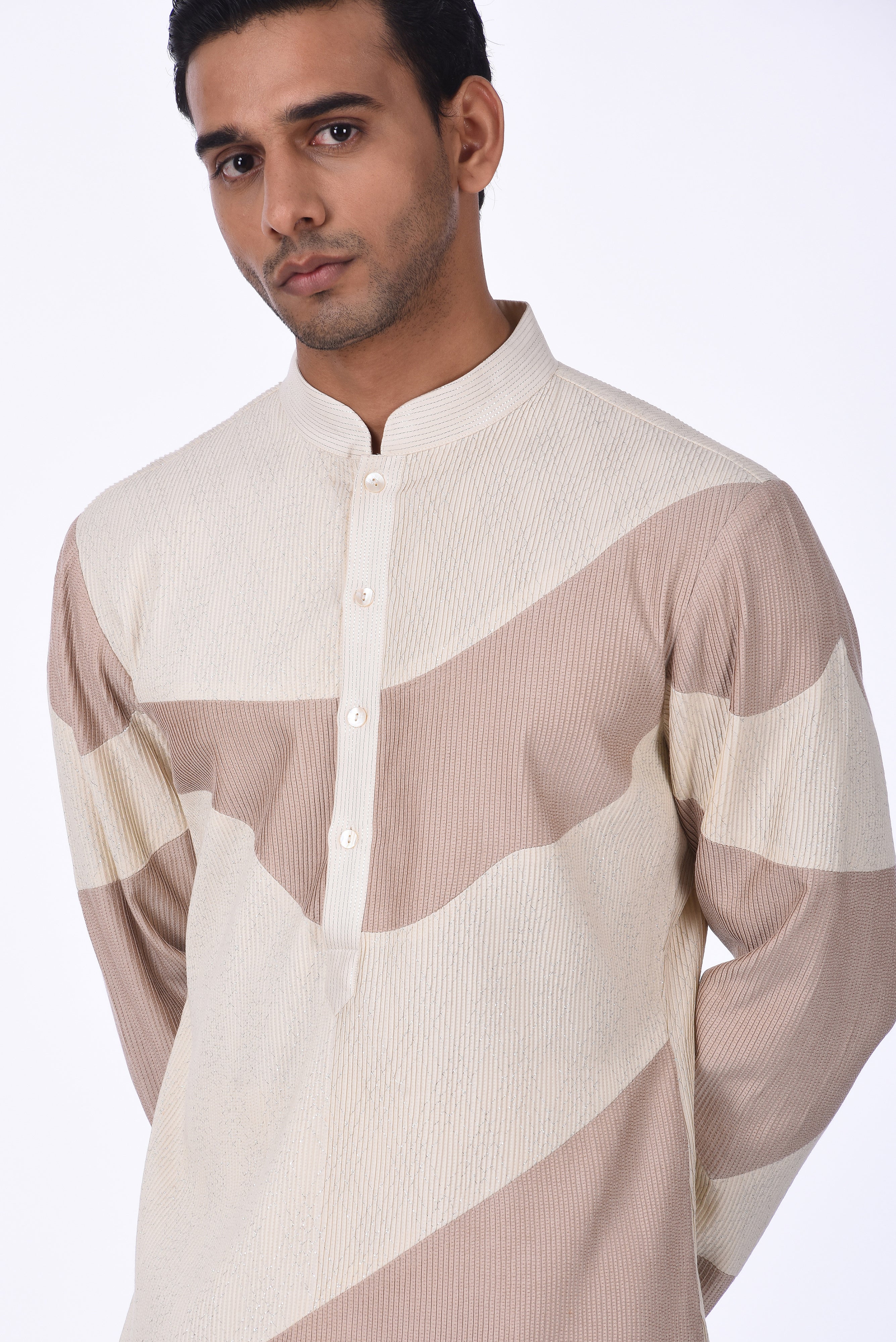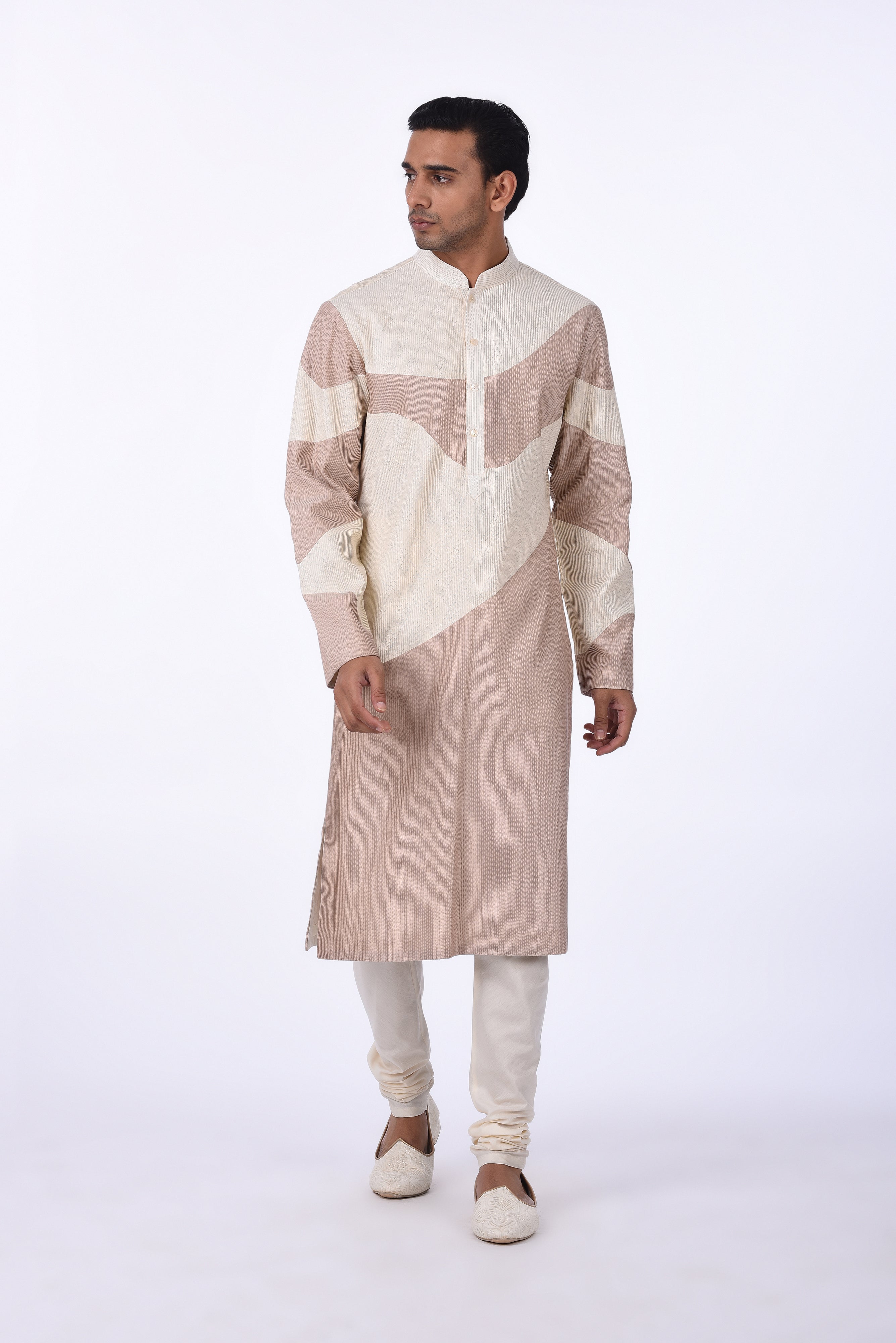 Features: This kurta features a bandhgala collar and a button-up front. The textured weave and asymmetric color blocks create a stylish, contemporary design.