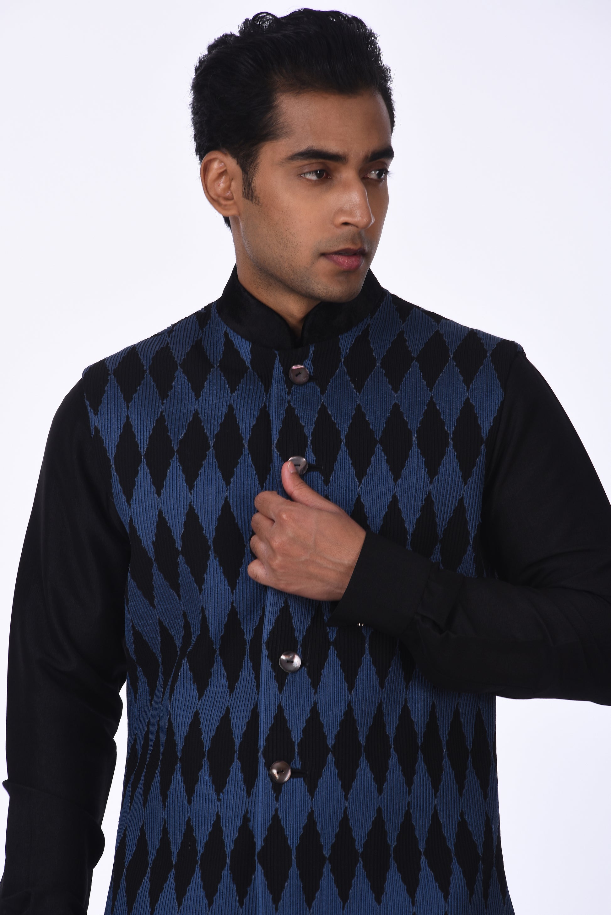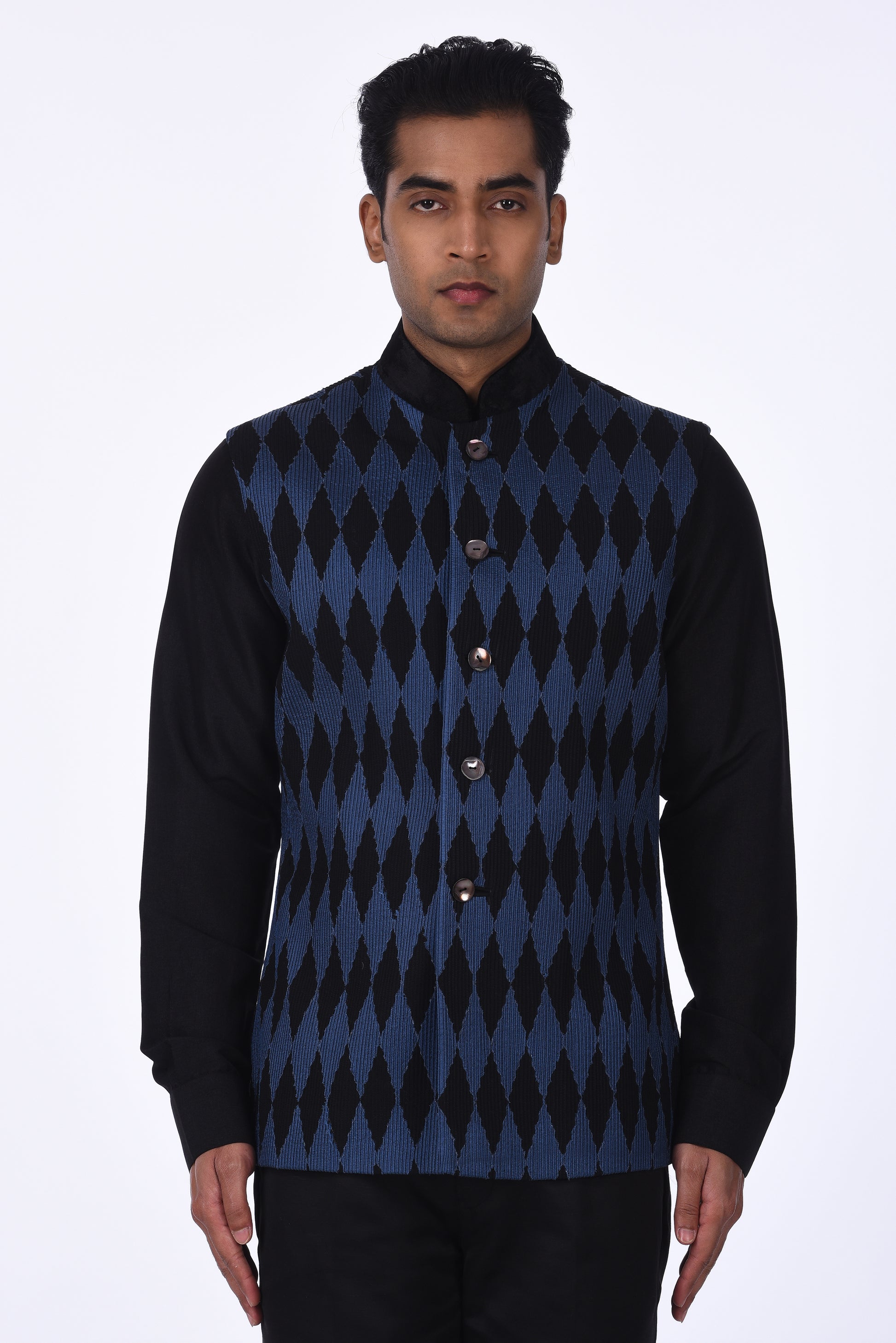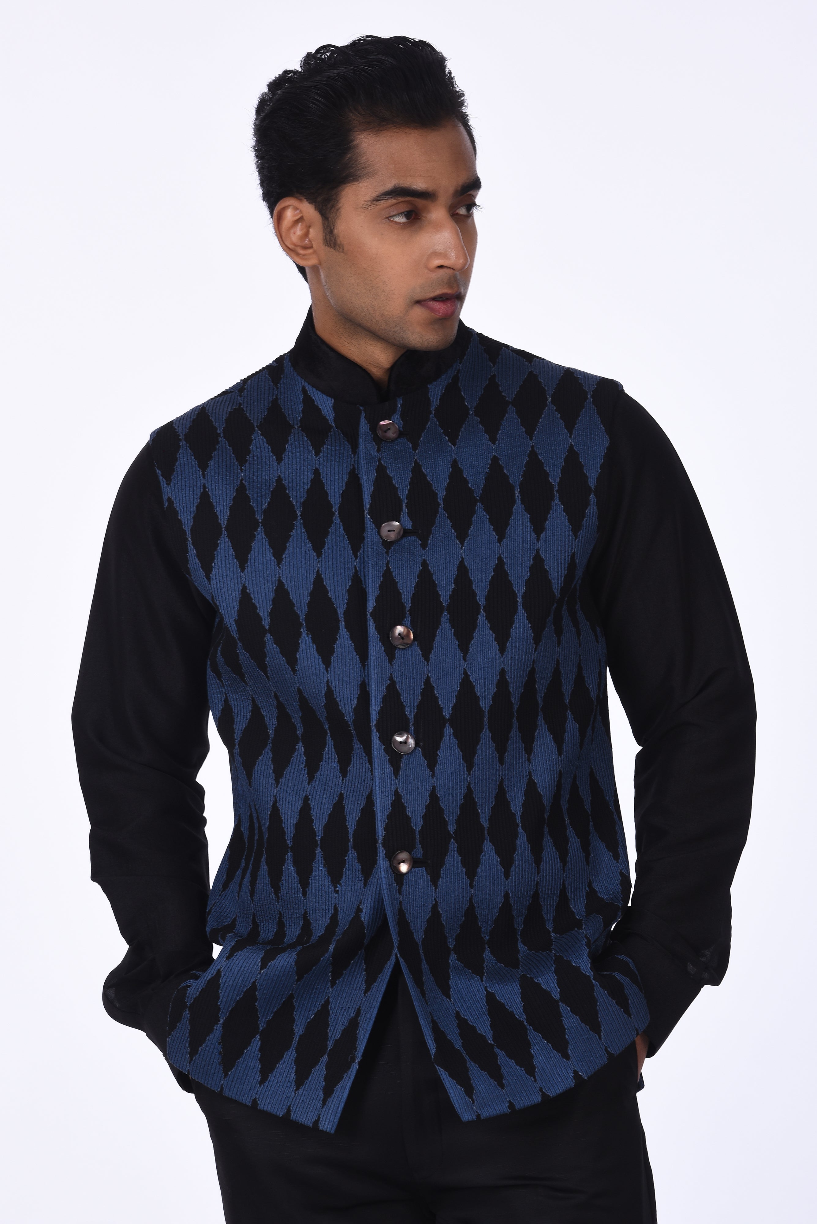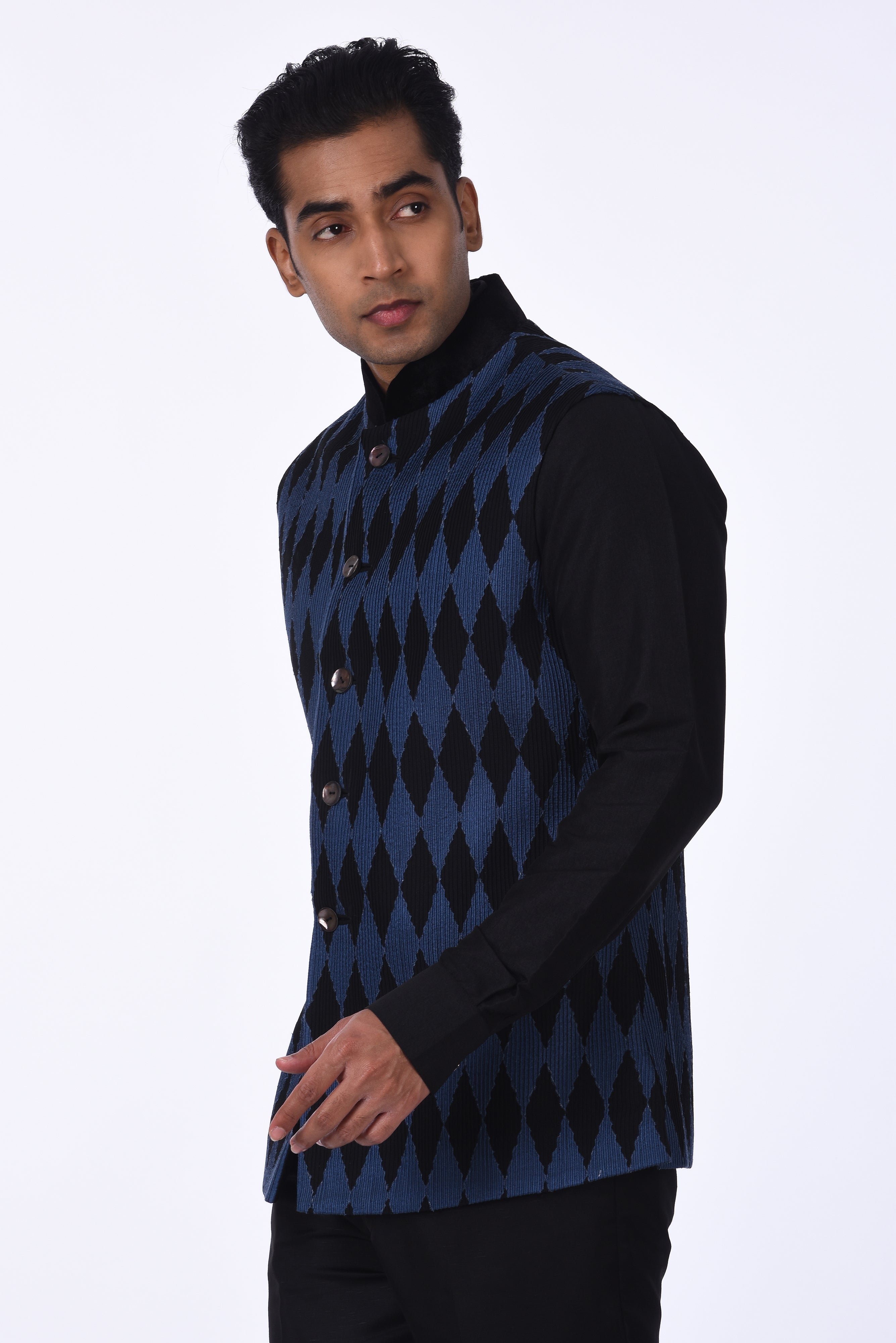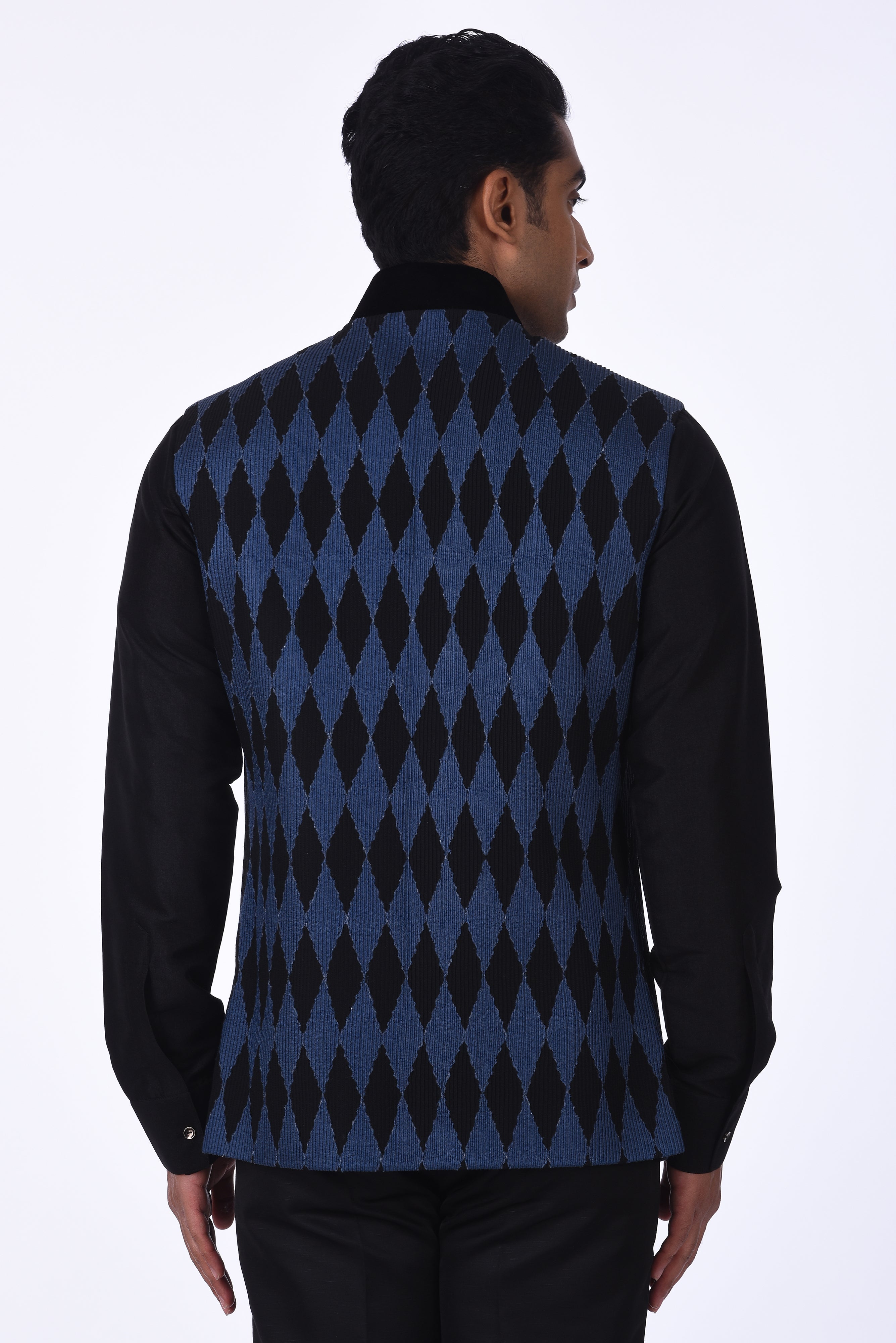 Color/Style: Deep blue and black argyle pattern with a black Mandarin collar and solid black back.