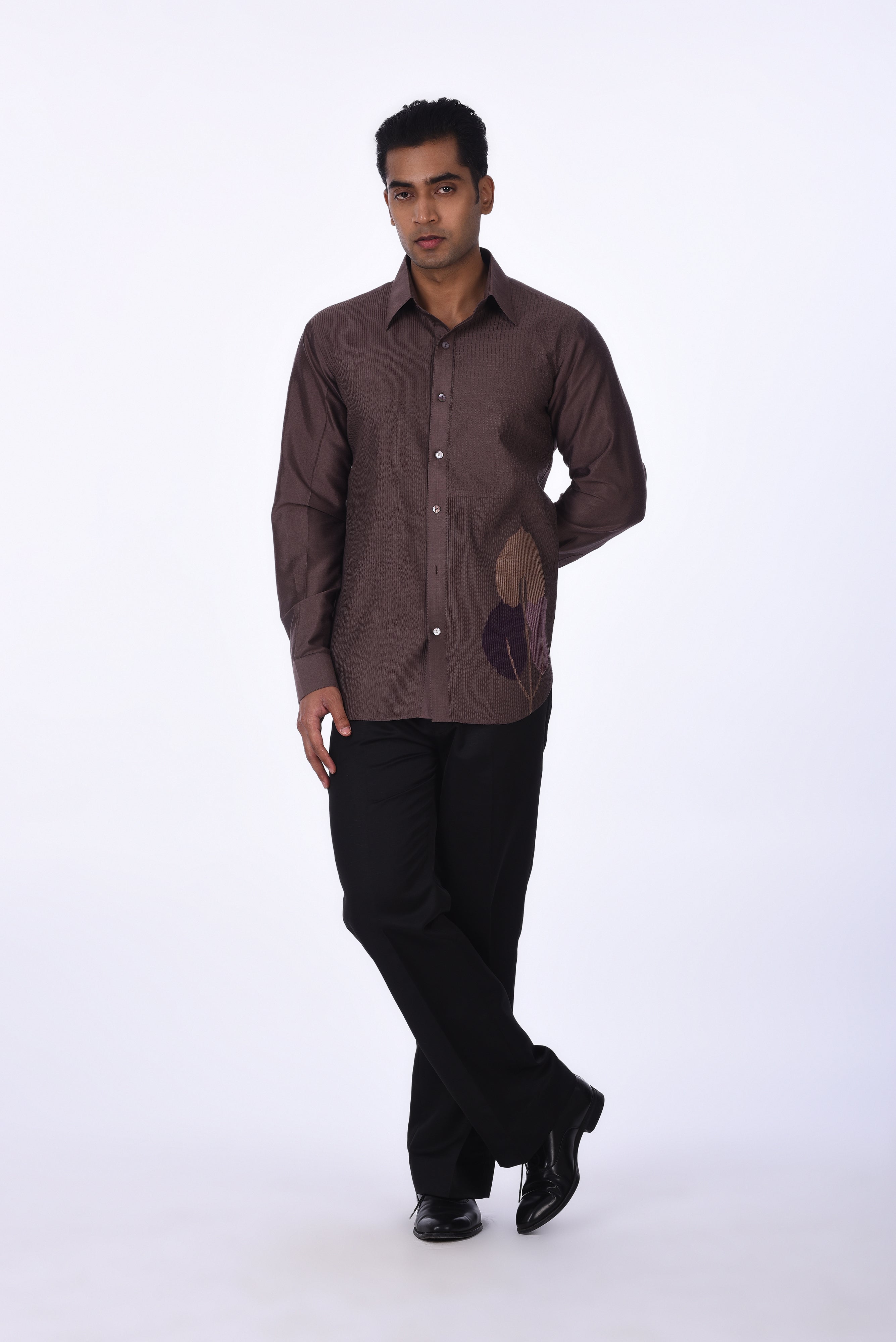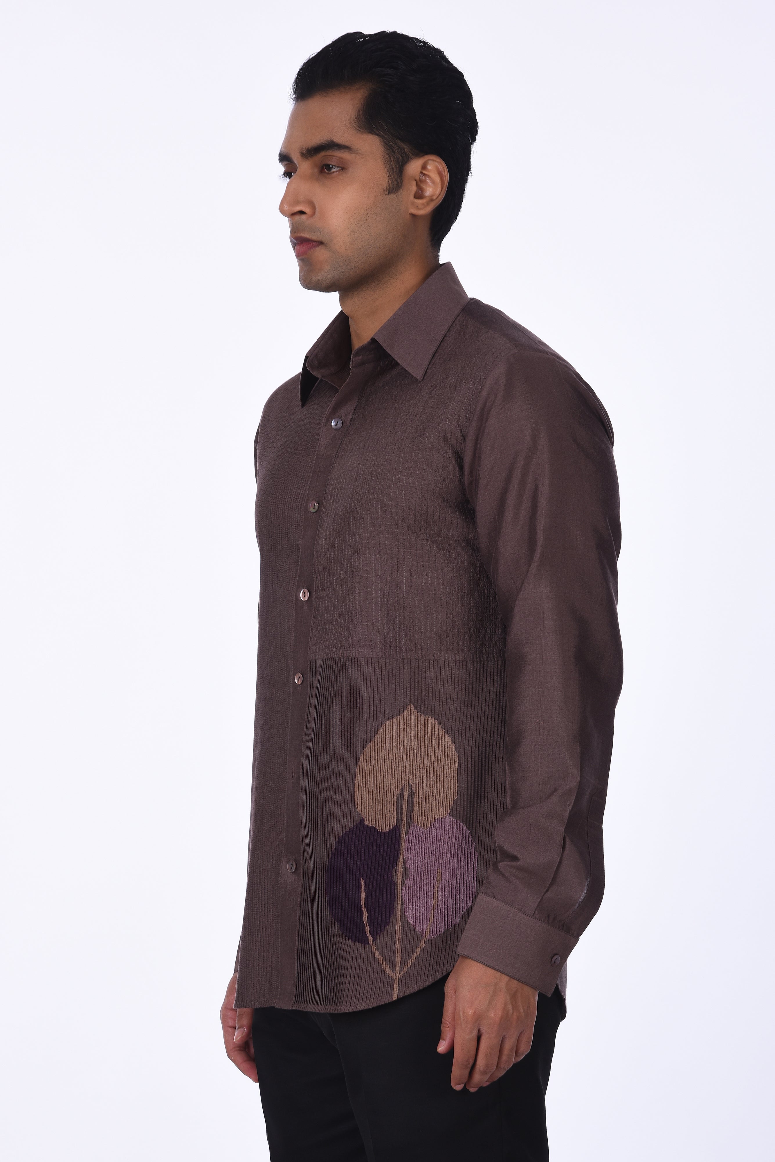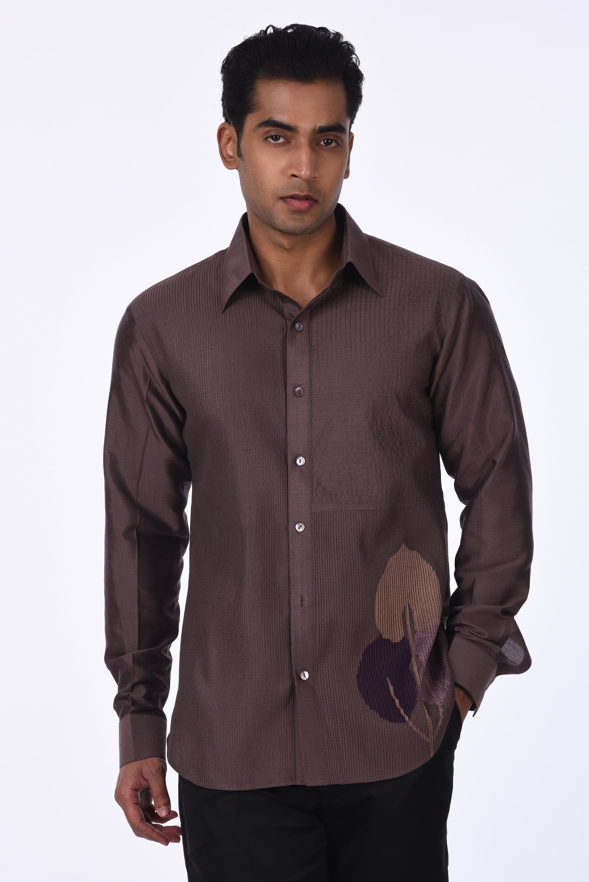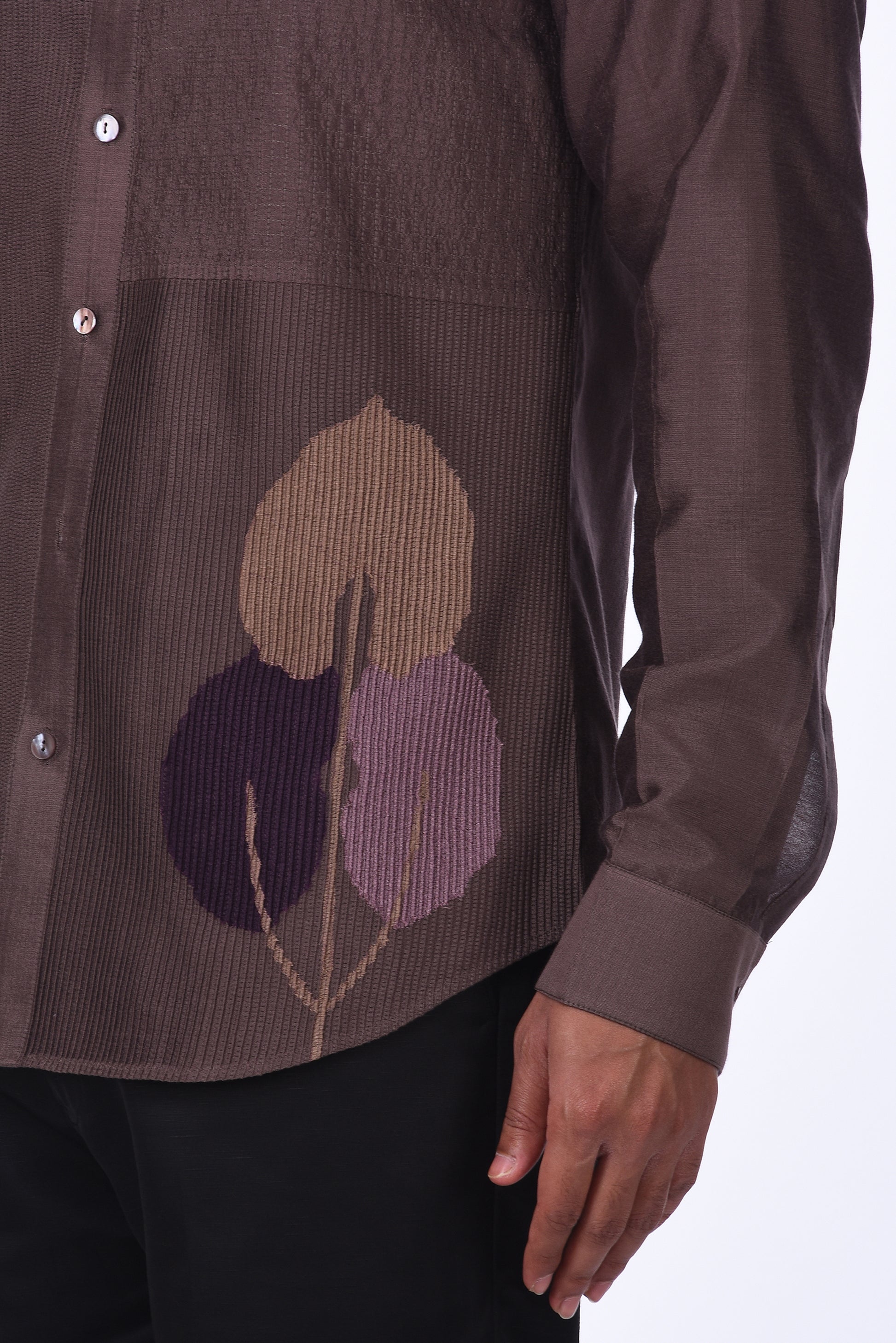 Features: This long-sleeved shirt has a classic collar and a button-front closure. The woven pattern on the body adds texture, while the distinct circle design gives it a modern, artistic touch.